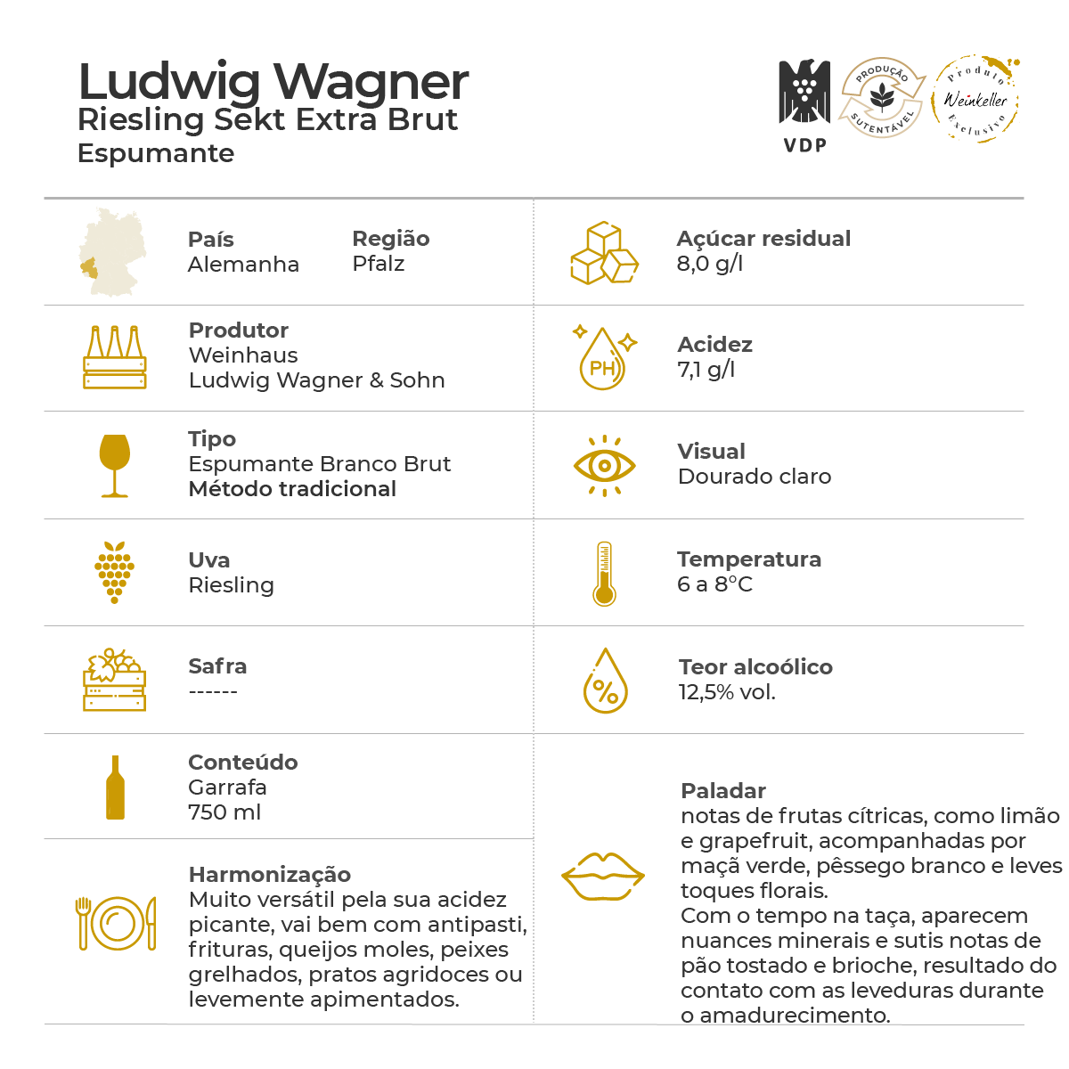 Este espumante 100% Riesling representa o rigor técnico da família Wagner. Elaborado pelo método tradicional, — o mesmo utilizado em Champagne — este Sekt passa por uma segunda fermentação dentro da própria garrafa e um longo período de maturação sobre as lias, resultando em um Brut elegante, com perlage fina e ótima textura, fresco e com excelente potencial gastronômico.