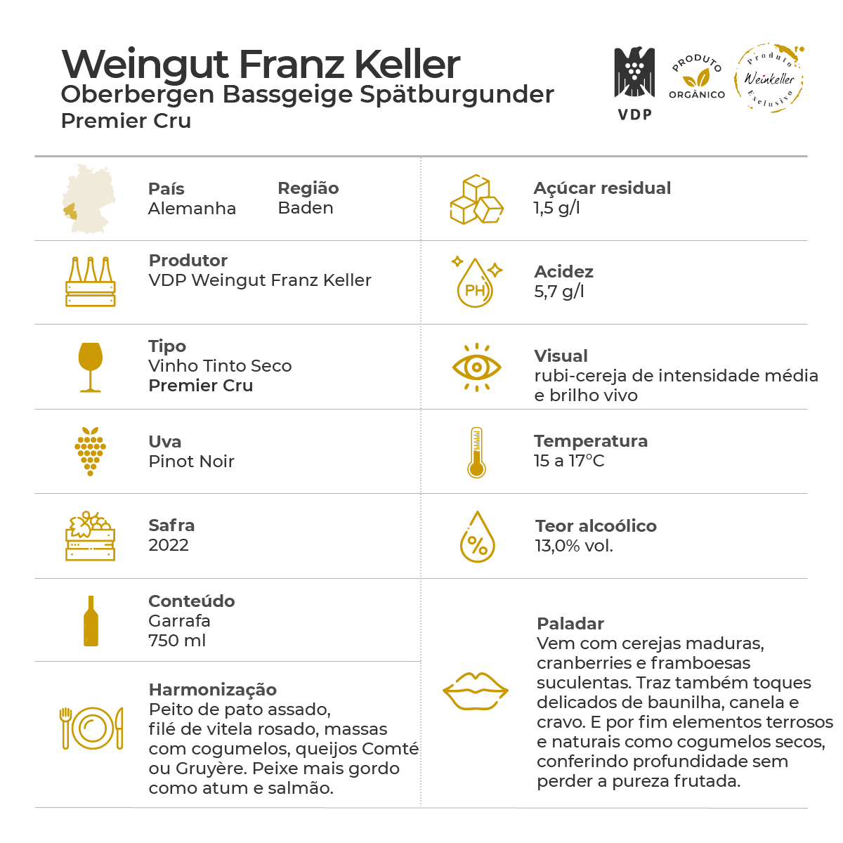 O Franz Keller Oberbergen Bassgeige Spätburgunder 2022 vem do vinhedo Oberbergen Bassgeige, plantado em terraços, um dos mais reconhecidos da região do Kaiserstuhl, em Baden. O solo é constituído por Löss (sedimento poroso e fértil) sobre basalto vulcânico, que confere aos vinhos uma mineralidade distinta, boa estrutura e equilíbrio entre fruta madura e frescor natural.