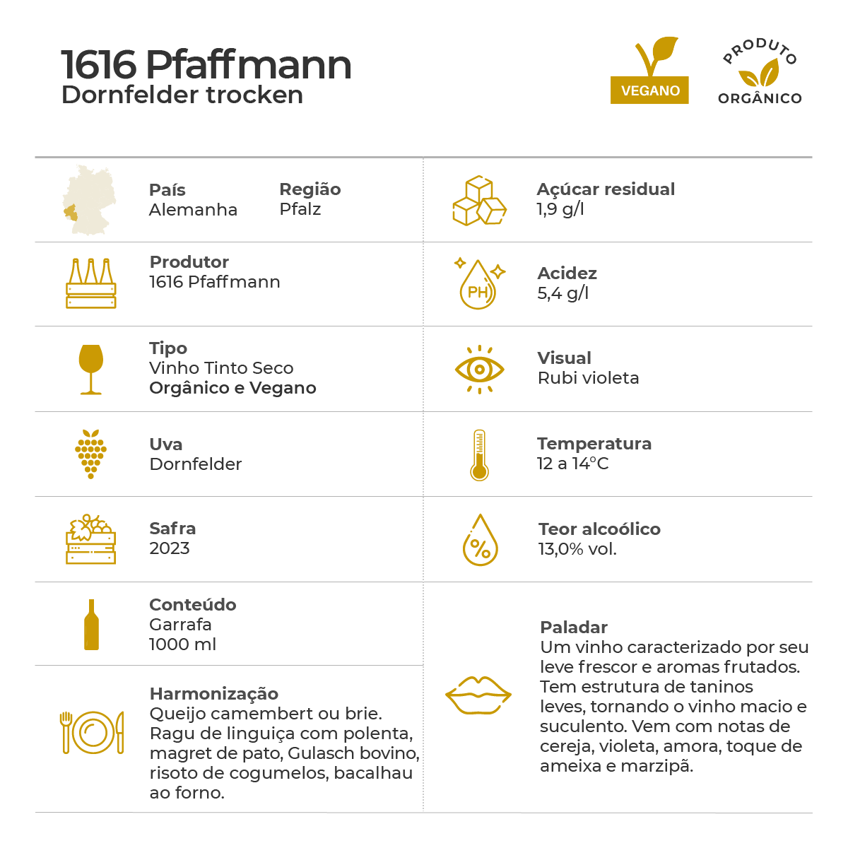 O Pfaffmann Dornfelder é um tinto moderno e frutado, intenso em cor e com personalidade clara. Ele combina intensidade de sabor, maciez e elegância, sem ser pesado. Idela para qum prcura um vinho equilibrado, com taninos leves e aromas marcantes de frutas silvestres.